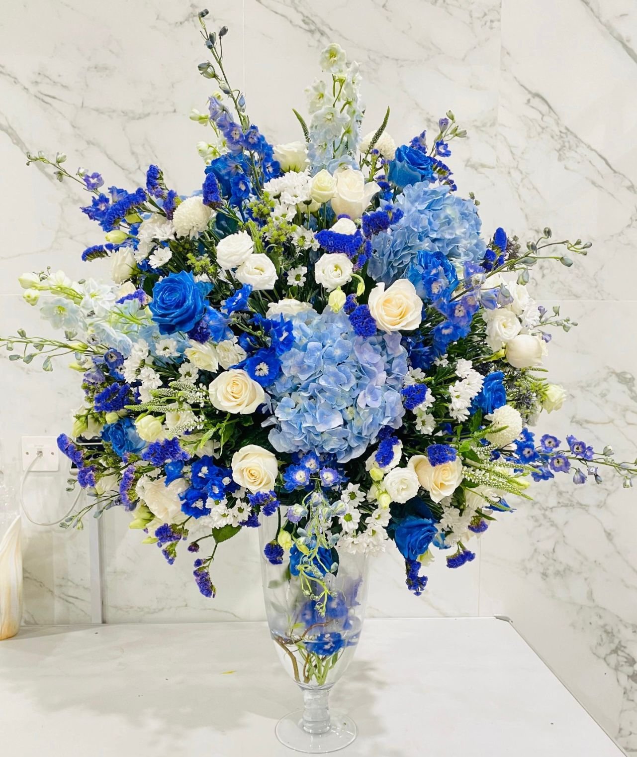 Bring timeless elegance to your space with our Elegant Blue and White Floral Arrangement. Designed with premium fresh blooms in calming shades of blue and white, this arrangement is perfect for weddings, corporate events, sympathy gestures, or as a sophisticated home decor piece.